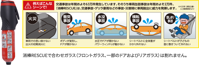 緊急時に役立つ「火を消す」「シートベルトを切る」「窓ガラスを割る」が
